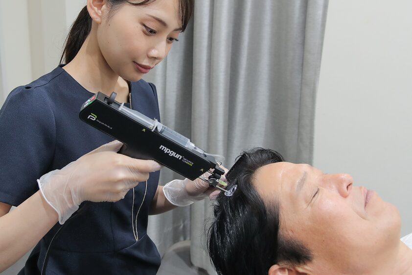連続高速注入「MPガン」は、設定した一定の深さ(効果の出る一定の深さ)に狙い撃ちで薬剤を高速注入できるマシンです。薬剤の流量、速度、深さを最適設定することで、AGA治療を行うことが可能です。従来のメソガンに比べて高速注入でき、また「ペンモード」という肌を再生しながら高速注入できるという新しいモードも搭載されています。このマシンを使用して皮膚に浅く、かつ密に注入し、薄毛の改善、育毛を促すメソセラピーを行います。